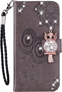 Karomenic PU Leder Hülle kompatibel mit Huawei P30 Lite Eule Glänzend Glitzer Handyhülle Brieftasche Bling Diamant Silikon Schutzhülle Klapphülle Magnet Ledertasche Flip Case Etui,Grau